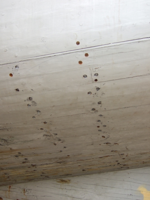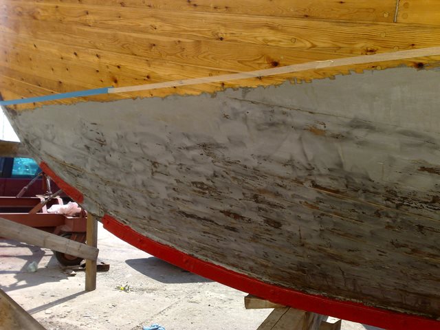 Her blir skroget pusset og oljet. Det ble også reparert noen sprekker i skroget og bunnen ble spikret opp.